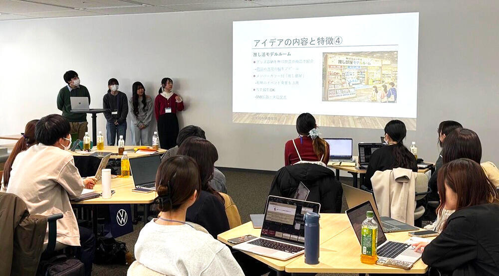 最終日は株式会社メンバーズ本社を訪問し、会社見学を経たのち、成果発表を行いました。4グループのテーマは、「推し活×無印良品~無印良品のFWを参考に~」、「未来への分岐点 無印良品有明店が創る「脱出アトラクション」型店舗」、「めぐりのパートナー-生産者と消費者をつなぐには-」、「つなぐを実験、MUJIラボ」であり、具体的な未来像を描き、それを実現させるための根拠に基づく解決策を挙げ、無印良品に援用する具体策を提案しました。学科が異なるメンバー構成の中、想像から創造へとアイデアを形にできたことは、今後受講生の力になっていくことと思います。