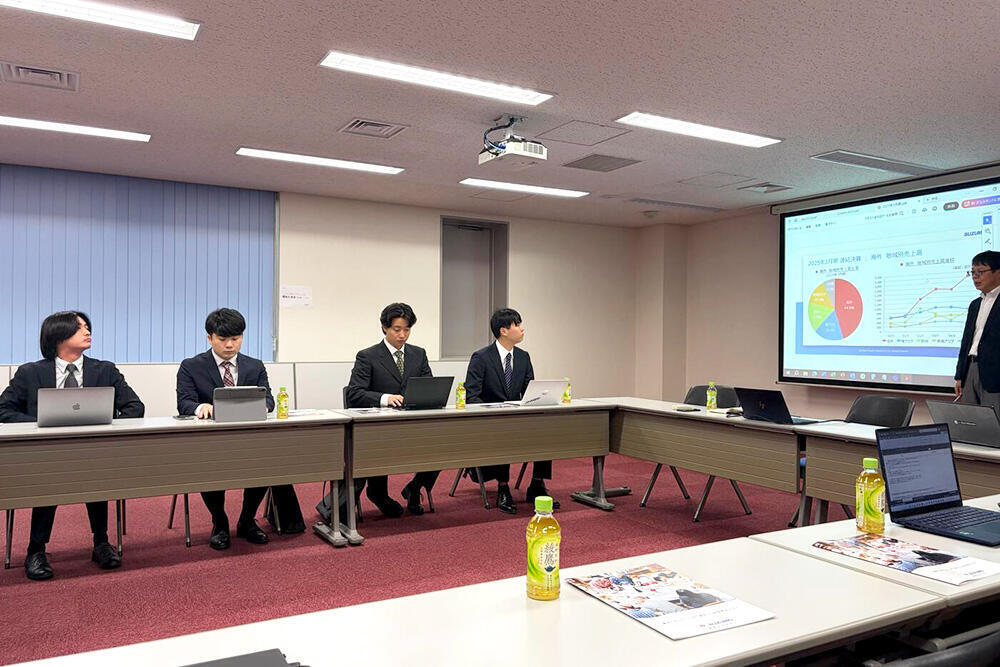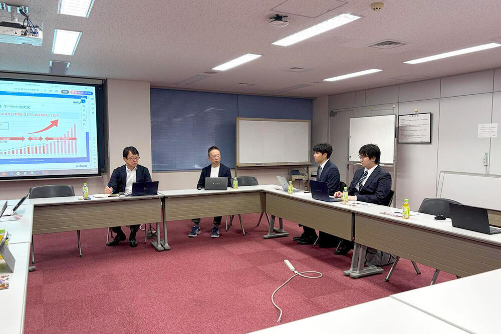 その後、髙辻准教授が著書『アナリストが教える リサーチの教科書』(ダイヤモンド社)にて提唱する業界企業分析のフレームワーク「ビジネスリサーチの4S(Structure=構造、Statistics=統計、Share=シェア、Strategy=戦略)」に基づいて、ゼミ生たちが事前に準備した26項目の質問を行いました。鈴茂器工株式会社の中期経営計画である「Next2028」で掲げる施策の進捗や課題などの質問があり、和やかな雰囲気で取材が行われました。