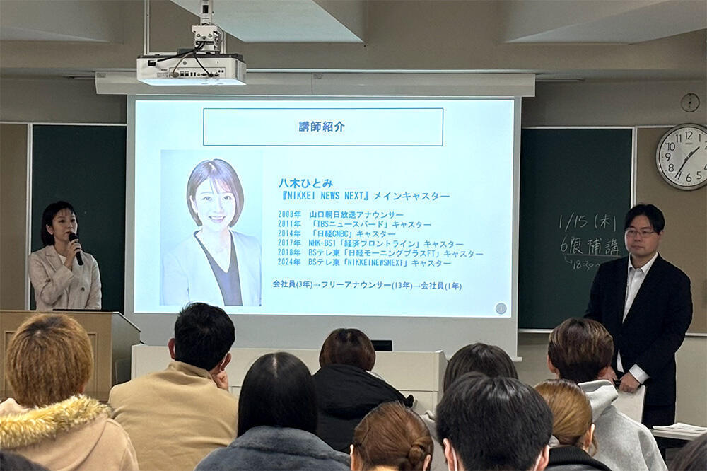 今回の講演は、髙辻成彦准教授が以前ゲスト出演した、BSテレビ東京の経済番組 「日経モーニングプラスFT」のメインキャスターを八木氏が務められていたご縁から実現しました。