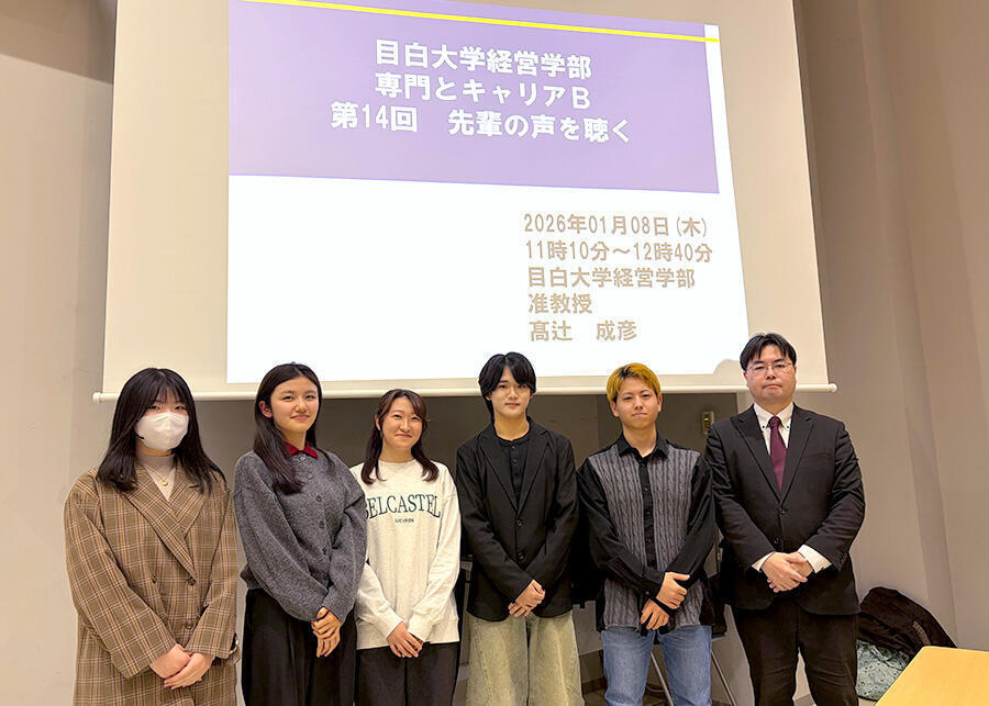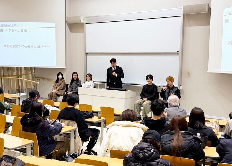 第14回講義では、経営学科4年生の内定者5人が登壇し、就職活動の取り組み状況についてQ&A形式で語りました。ファシリテーターは、担当教員の髙辻成彦准教授が務めました。