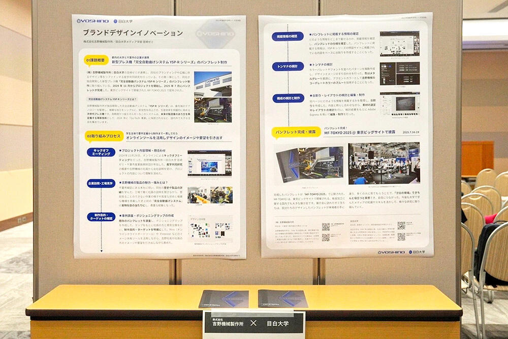 その第一段階として、吉野機械製作所の新型プレス機「YSP-R Series」を紹介するパンフレットをゼミ生がデザインし、その成果をについて報告しました。発表では、プロジェクトの背景や取り組み内容、成果物について紹介しました。発表後は、ポスターセッションが行われ、参加した企業関係者からも関心が寄せられました。