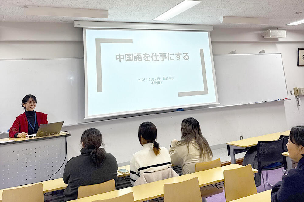 1月7日(水)、外国語学部中国語学科では、2025年度「中国語キャリア チャレンジ支援」特別企画の一環として、中国語翻訳者として通訳・翻訳の現場で活躍してきた本多由季氏を講師に迎え、「中国語を仕事にする」をテーマとした特別講義を実施しました。本講義では、本多氏自身の経験を基に、中国語との出会いから留学、資格取得、そして仕事につながるまでの道のりが、率直な語り口で紹介されました。
