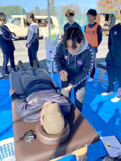 さらに、ブースでは研究部OBの先輩による選手のケアを見学する機会があり、学生たちはスポーツ現場での実践を指導してもらいました。