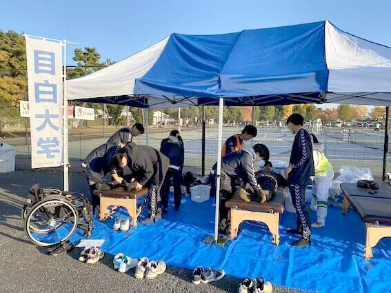 さらに、ブースでは研究部OBの先輩による選手のケアを見学する機会があり、学生たちはスポーツ現場での実践を指導してもらいました。