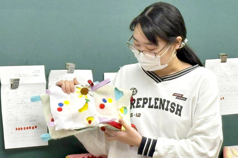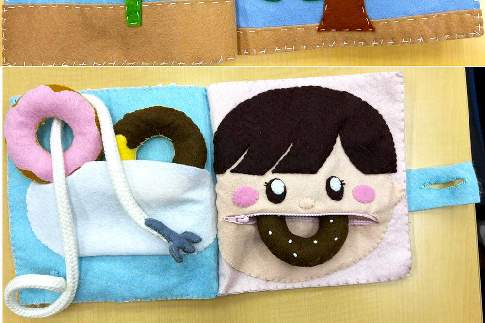 人間学部子ども学科2年次の専門教育科目「乳児保育演習」では、3歳未満児の発達や生活に即した援助を実践的に学ぶことを目的として、布絵本の制作に取り組み、品評会および発表会を行いました。