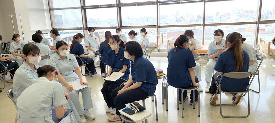 看護学部看護学科3年次では、6月から12月まで約半年間にわたり、成人、老年、地域・在宅、母性、小児、精神の各領域で臨地実習を行ないます。