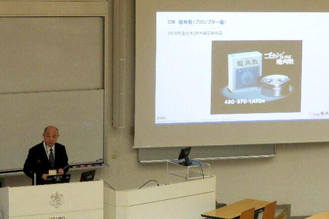 200年以上前に「龍角散」が誕生して以来、さまざまな苦難を乗り越えて事業を継続してきたことや、売上低迷期に「のど専門メーカー」のポジションに回帰したことをお話しいただきました。また、歴代のテレビCMを投影しながら、医薬品と食品による広告規制の違いにより表現方法が変わることを具体的にご説明いただきました。