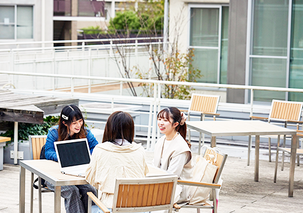 天気の良い日にはおしゃべりをしたり、ランチをとる学生でにぎわう憩いの場となっています。開放感あふれるスペースです。