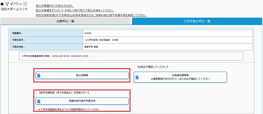 合格した方は「入学手続申込一覧」タブより、「合格通知書類」「振込依頼書」等のダウンロード・印刷が可能です。