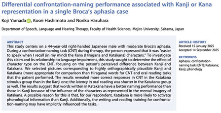 言語聴覚学科・山田晃司助教らの論文が学術雑誌「Neurocase」に掲載されました