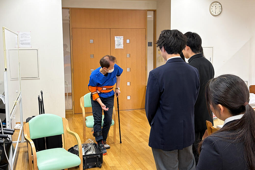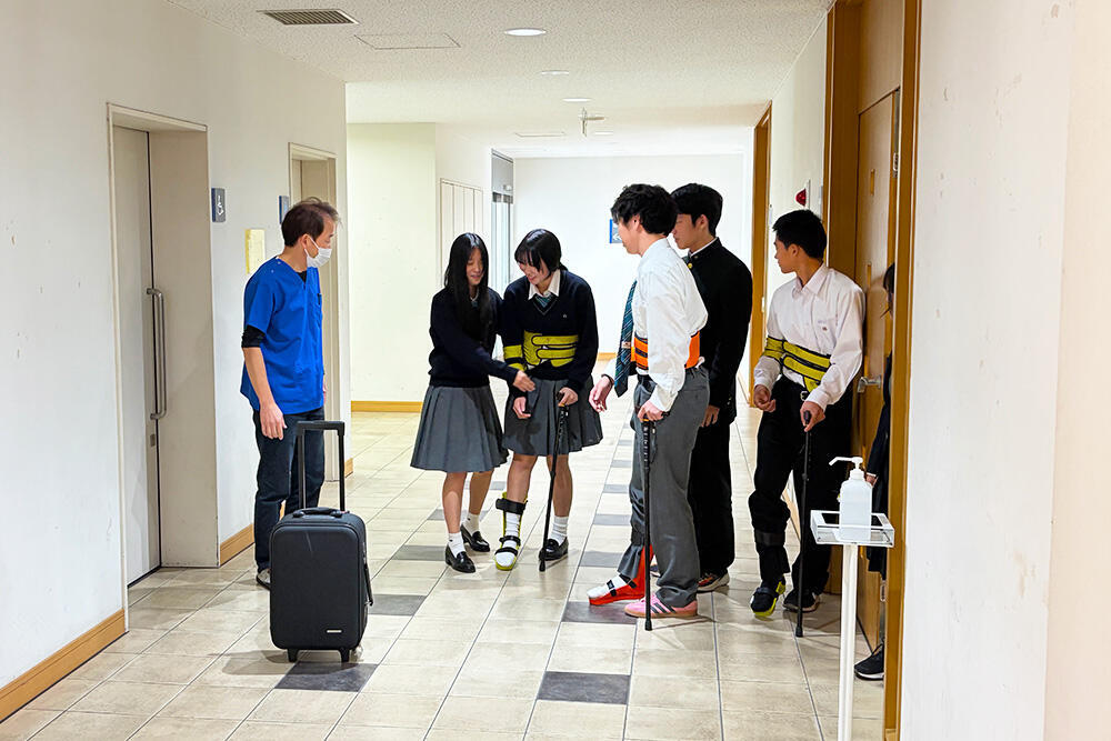 課題の取り組み状況を担当の小林幸治教授が高校生にヒアリングしながら、進め方を分かりやすくアドバイスしました。また実際の身体障がい者の方の動画を視聴し、身体障がいを体感できる器具を高校生が装着し、身をもって実感する内容になりました。