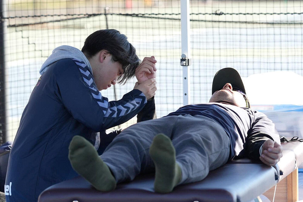 スポ研の学生たちはブース運営だけではなく、試合中のボールパーソンとしても活躍しました。さらに、スポ研の卒業生も会場に駆けつけ、学生たちへ指導をしてくれました。学生たちは選手の体に触れながら、OBや工藤教授からコンディショニングについての指導を受けていました。